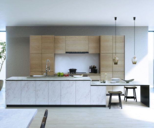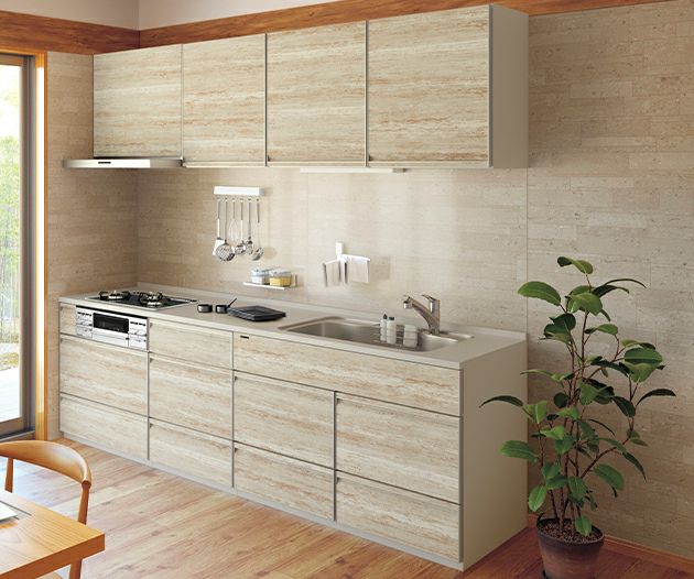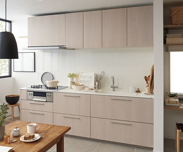 掃除がしやすいガスコンロ、スムーズな開閉で容量が大きい収納、洗い物の手間が省ける食器洗い乾燥機など、お客さまの使い勝手とお好みに合わせたシステムキッチンをご提案いたします。