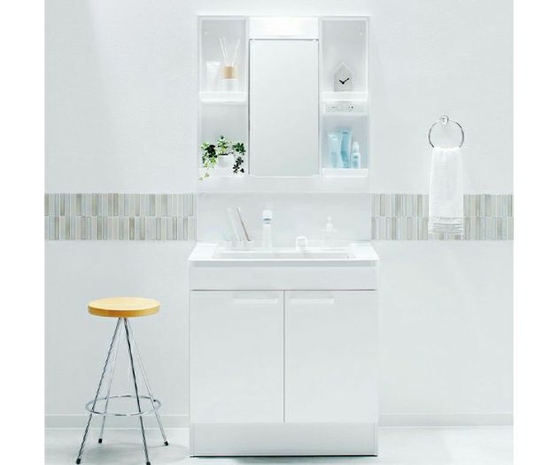 洗面化粧台の扉や壁、床の色を木目調のナチュラルテイストにしたり、清潔感のあるホワイト系に統一するだけでも明るい印象になります。