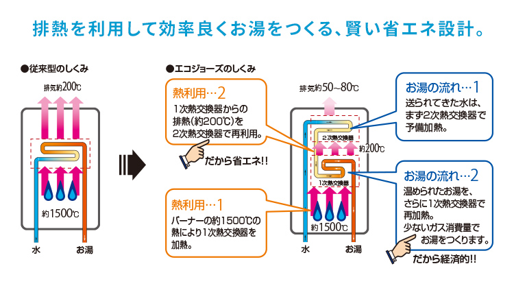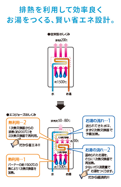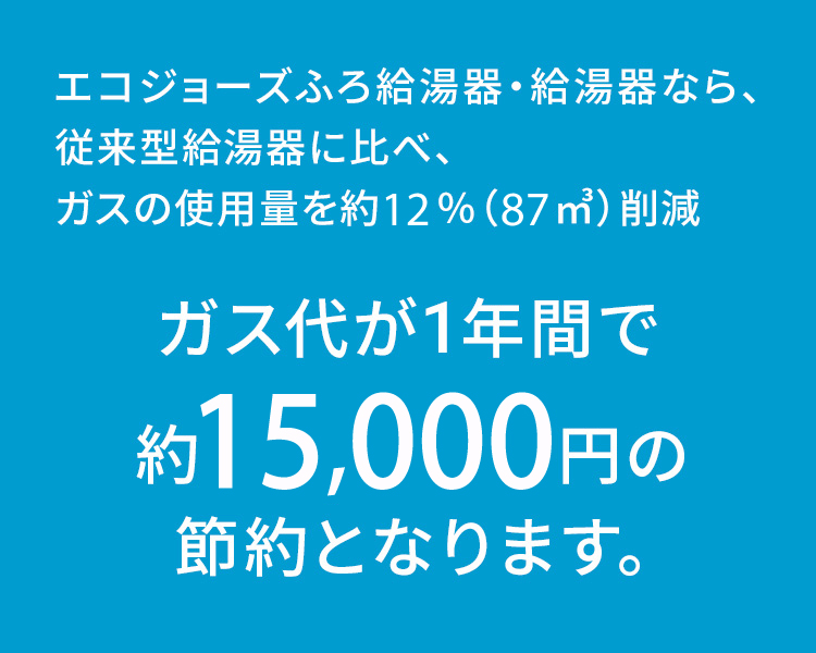 エコジョーズふろ給湯器・給湯器なら、従来型給湯器に比べ、ガスの使用量を約13%(約135m³)削減。ガス代が1年間で約19,000円節約できます。