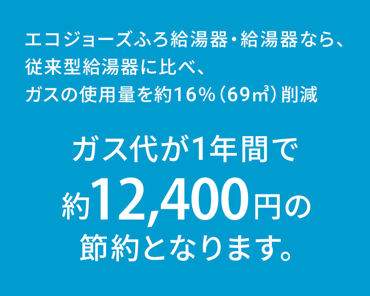 エコジョーズふろ給湯器・給湯器なら、従来型給湯器に比べ、ガスの使用量を約12%(約87m³)削減。ガス代が1年間で約15,000円節約できます。