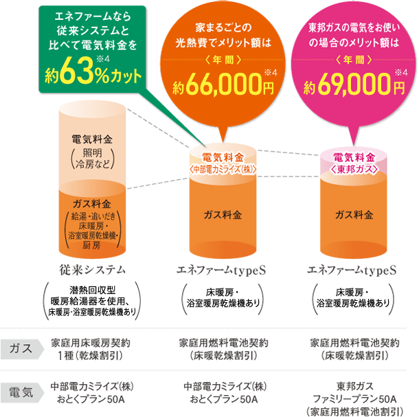 加えて、エネファームtypeSで発電した電気を使うことで、従来システムと比べて電気料金を削減。