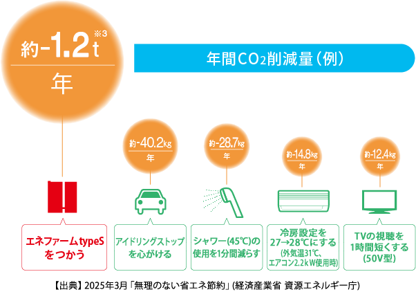 エネファームtypeSは、従来のシステムに比べて年間約1.5t※1のCO2を削減できます。