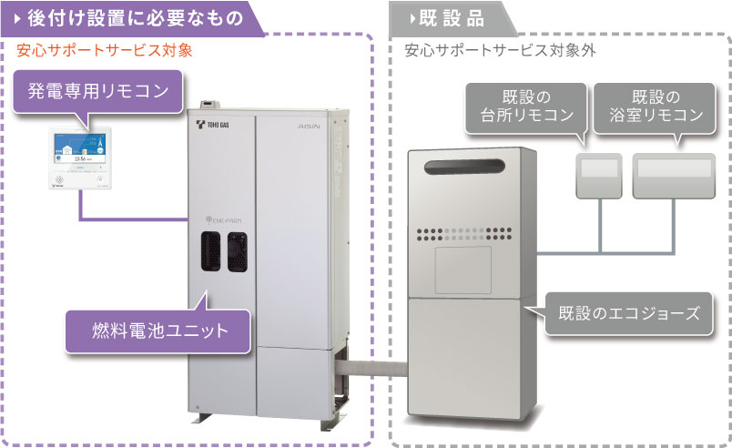○既設のエコジョーズを利用して、後付けで燃料電池ユニットを設置する場合、既設のエコジョーズ(台所・浴室リモコンを含む)およびそれに接続されている端末機(床暖房リモコン、浴室暖房乾燥機(リモコン含む)等)等は安心サポートサービスの対象外となり、既設のエコジョーズや端末機等の修理は有償です。