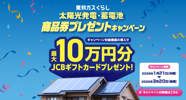 - ●本キャンペーンの内容は2026年1月21日(水)時点のものです。東邦ガス(株)が必要と判断した場合には、予告なくいつでも本キャンペーンの内容を変更および停止、中止、終了することができるものとします。