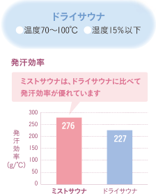 ミストサウナは低温で湿度が高く、お肌になじみやすいのが魅力。乾いた熱気の中で汗をかくドライサウナと比べて、カラダへの負担が少なく、気持ちよく汗をかくことができます。